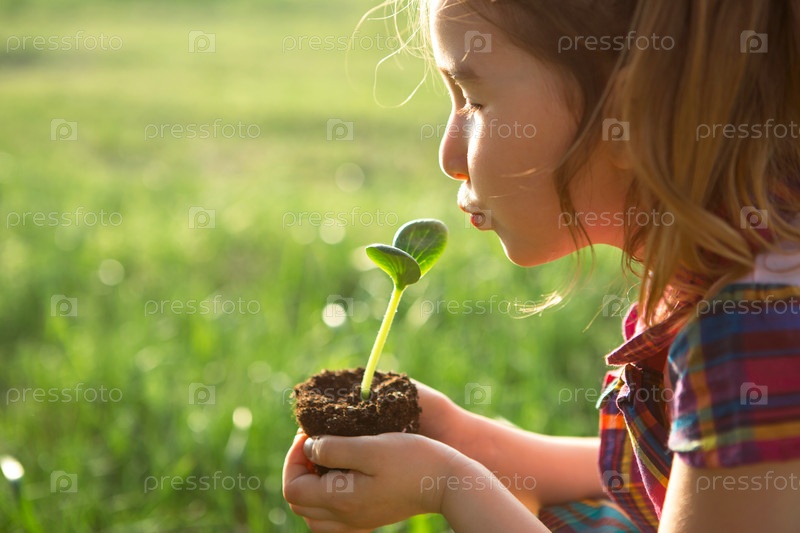 Молодой зеленый росток в руках ребенка в свете солнца на фоне зеленой травы. Натуральные саженцы, экологичность, новая жизнь, молодость. Концепция развития, мира, заботы. Копировать пространство