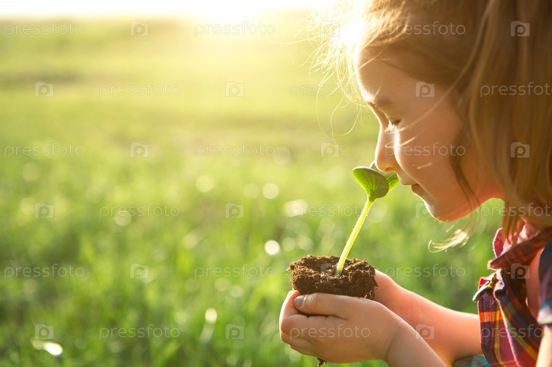 Молодой зеленый росток в руках ребенка в свете солнца на фоне зеленой травы. Натуральные саженцы, экологичность, новая жизнь, молодость. Концепция развития, мира, заботы. Копировать пространство