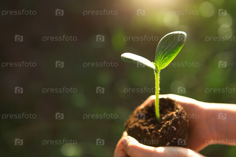 Молодой зеленый росток в руках ребенка в свете солнца на фоне зеленой травы. Натуральные саженцы, экологичность, новая жизнь, молодость. Концепция развития, мира, заботы. Копировать пространство