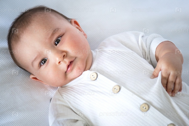 Симпатичный портрет младенца в кроватке крупным планом. Ребенок в белой одежде на белом нижнем белье. Нежность и забота, детские проблемы