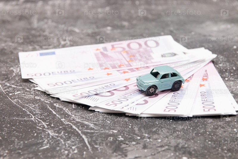 Миниатюрная автомобильная игрушка на пачке 100-долларовых купюр, покупка концепции подержанного автомобиля, ретро-автомобиль