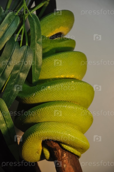 Зеленый питон. Большой питон на ветке. Питон обернут вокруг ветки. Рептилия. Террариумное животное. Зоопарк животных