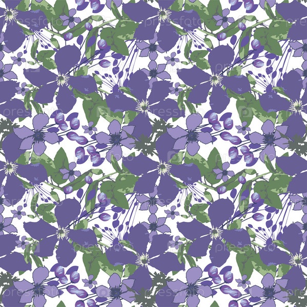 Бесшовный узор вектор с цветами. Фиолетовые цветы с листьями. Молодые цветы и бутоны