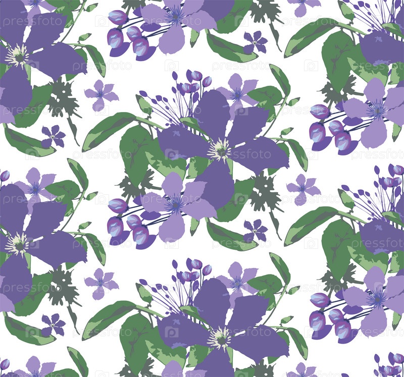 Бесшовный узор вектор с цветами. Фиолетовые цветы с листьями. Молодые цветы и бутоны