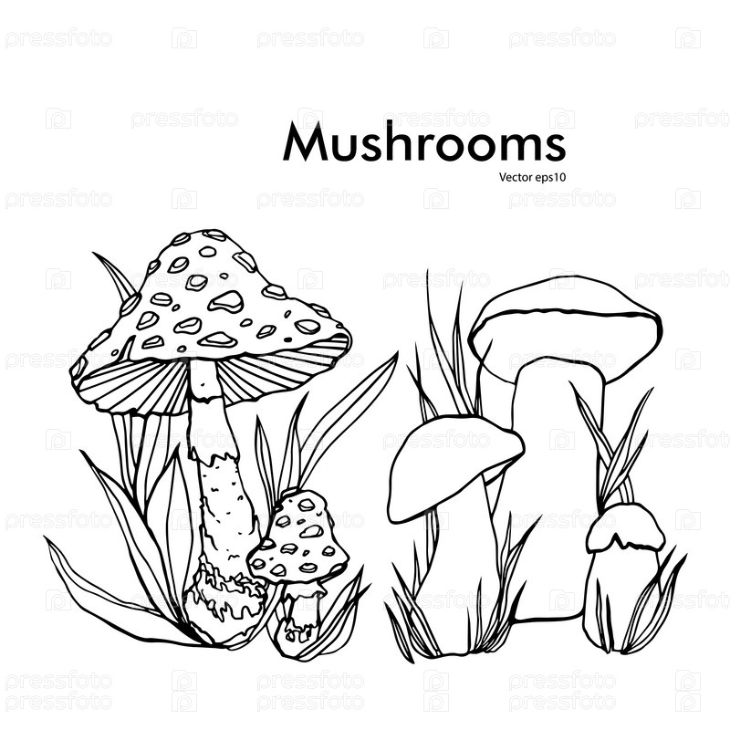 Векторные грибы. Силуэт гриба. Чернильный рисунок. Векторные эскизы. Линейные рисунки. Листья и травы