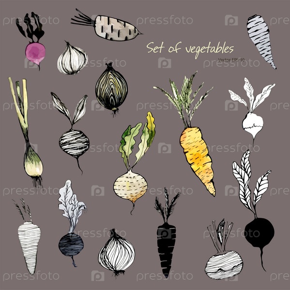 Овощи. Набор овощей. Рисование еды. Пищевые зарисовки. Красочные овощи. Чернильный рисунок. Векторные эскизы