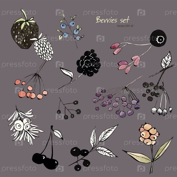 Ягоды. Набор векторных ягод. Ягоды и листья тушью. Рисунок в векторе. Красочная вегетарианская еда. Растения в древесине