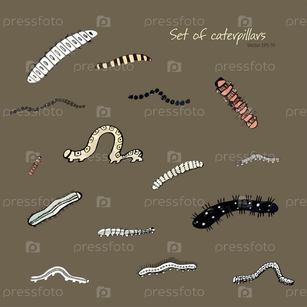 Набор гусениц и червей. Векторные зарисовки насекомых. Разноцветные гусеницы. Чернильные рисунки