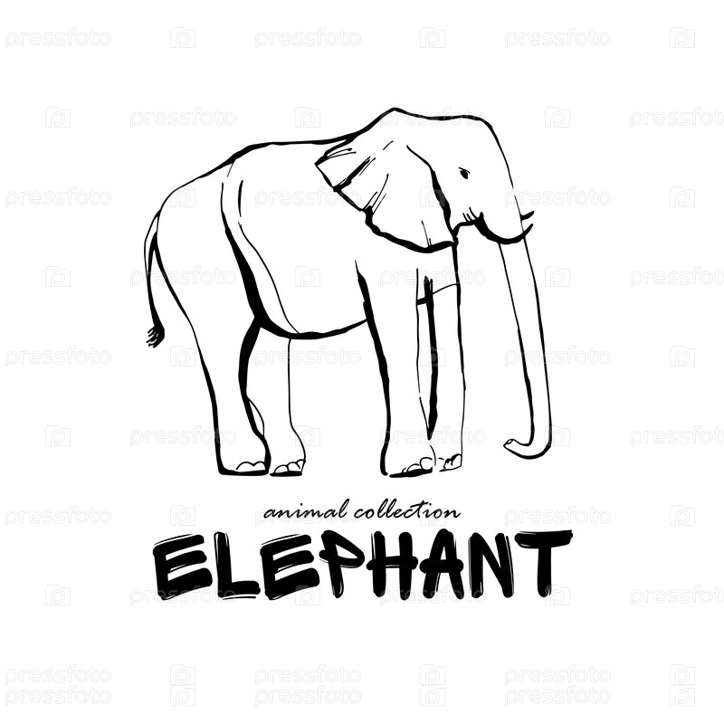Силуэт слона. Голова и тело слона. Эскиз африканского дикого животного. Зоопарк животных. Чернильный рисунок