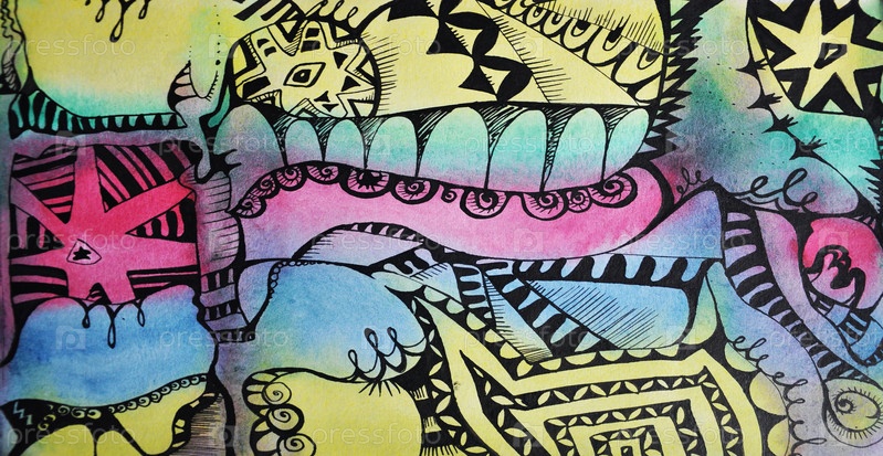 Причудливый текстурный фон. Черная линейная графика на цветном фоне. Абстракция цветом и линией. Черные полосы, линии, принты. Красивый цветной фон. Градиент. Чернила и линии пера. Текстура и текстура для фона