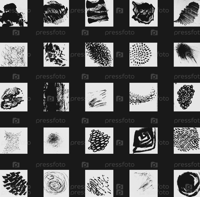 Большой набор рисунков из линий и пятен. Графические чернила и ручки. Черно-белая графика. Набор карт. Ахроматический