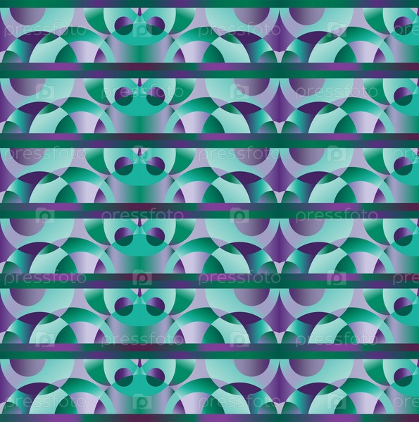 Бесшовный орнамент зеленого и фиолетового цветов. Цветной орнамент из кругов и лент. Орнамент из красивых бордюров. Векторная иллюстрация