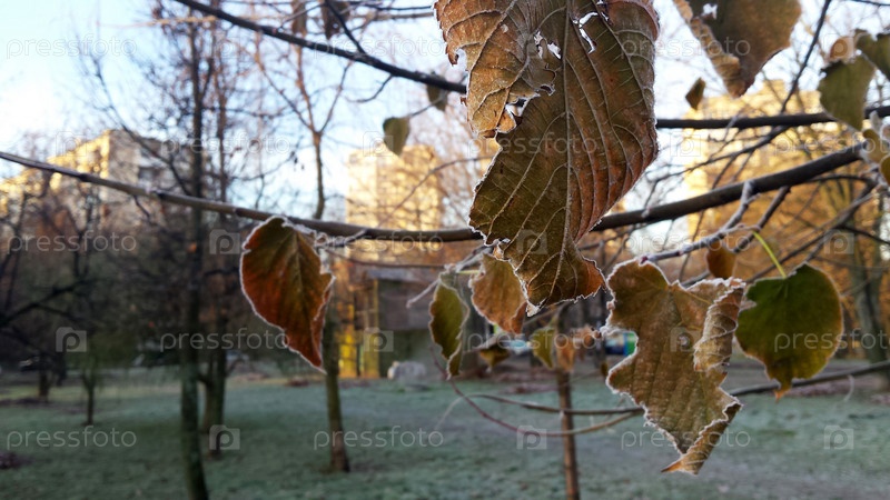 Листья в морозный мороз крупным планом. Зима в городе. Природа