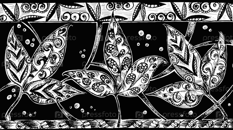 Чернила и чернильная графика. Цветы тушью и перьями. Декоративная стилизация. Красивые цветы в черно-белом. Монохромная композиция. Монохромный рисунок цветов. Эскиз цветов и листьев