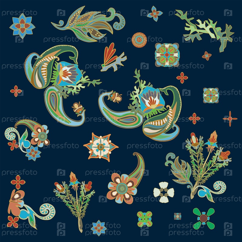 Набор элементов цветов и листьев тропиков. Экзотические детали узора. Цветные цветы и бутоны. Векторная иллюстрация