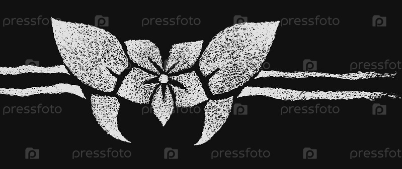 Белый силуэт цветка с листьями на черном фоне. Рисование тушью. Белый рисунок на черном фоне