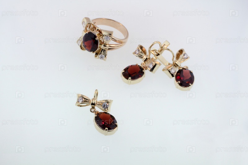 Комплект украшений с красными камнями. Бриллианты и рубины. Кольца, серьги и подвески