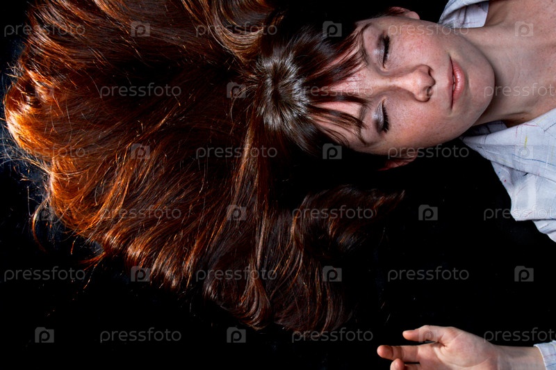Портрет брюнетки с длинными волосами на черном фоне
