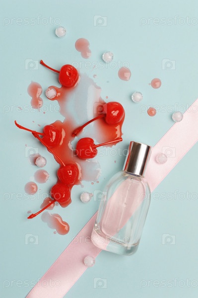 Флакон духов на голубом фоне с розовой лентой. Коктейльная вишня в пролитом сиропе. Рекламная концепция