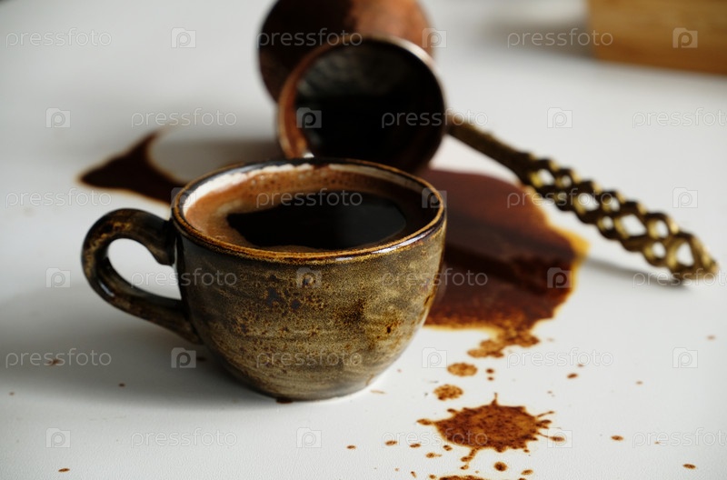 Чашка турецкого кофе и перевернутая турка с пролитым кофе. Белый фон, крупный план