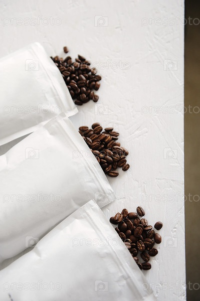 Жареные кофейные зерна разных сортов высыпаются из трех белых пачек на стол