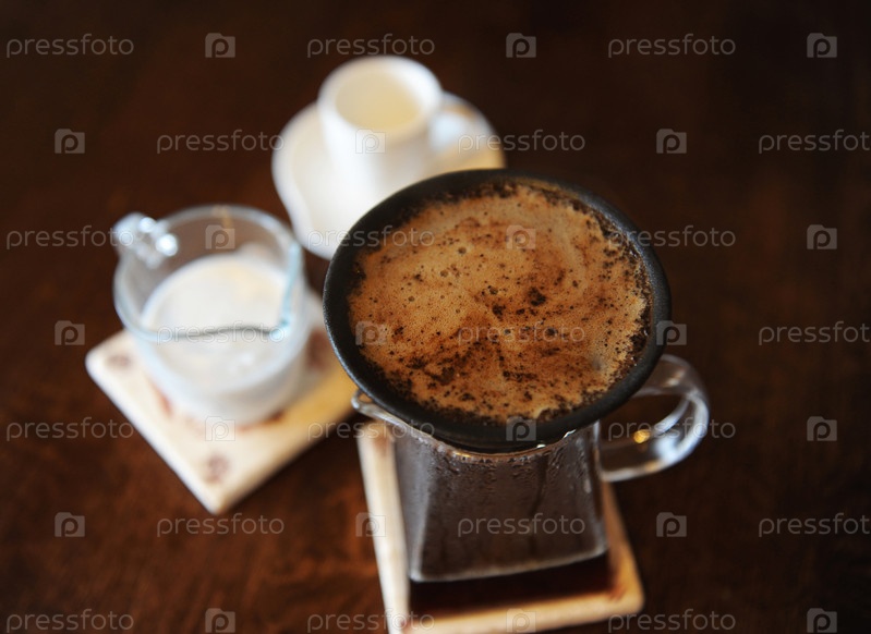 Приготовление кофе в черном безбумажном пористом керамическом фарфоровом фильтре на стеклянном кувшине. Белая чашка и молочник со сливками