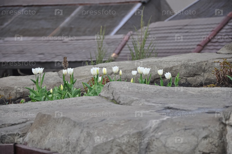 Белые цветы. Белые тюльпаны. Цветы и камни. Каменный пол