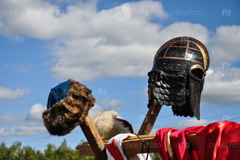 Средневековый шлем. Средневековая шляпа. Историческая одежда. Головные уборы средневековья. Старый забор. Декорации к фестивалю. Историческая реконструкция. Металлические аксессуары