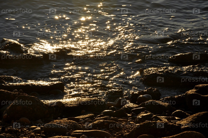 Камни и вода у берега. Мокрые камни. Вода крупным планом. Скалистый берег. Закат в море. Берег в темноте. Текстура воды и камней. Летнее время