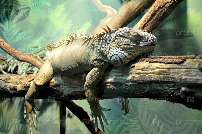 Игуана. Игуана спит. Зеленая игуана. Ящерица на дереве. Ящерица сидит. Рептилия. Террариумное животное. Зоопарк животных