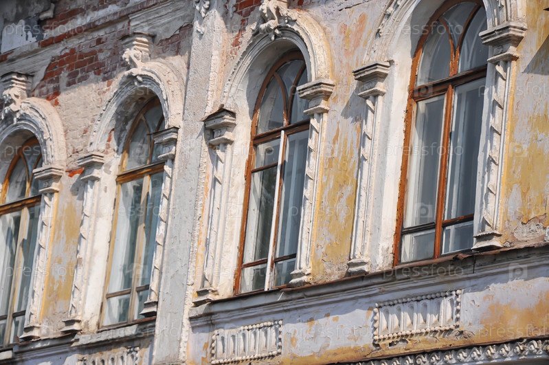 Старое здание. Историческая архитектура. Старые окна крупным планом. Старая стена. Стекло в окнах