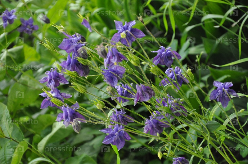 Цветок аквилегии. Синие и сиреневые цветы. Цветы и бутоны в саду. Зеленая трава и растения