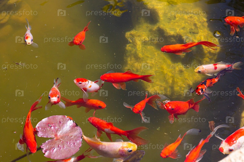 В пруду плавают разноцветные рыбки