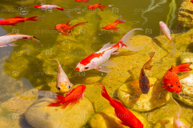 В пруду плавают разноцветные рыбки