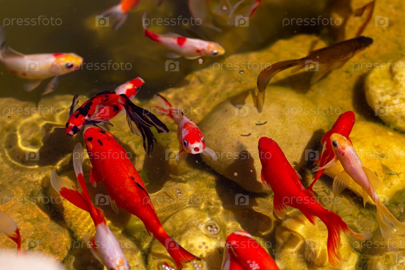 В пруду плавают разноцветные рыбки