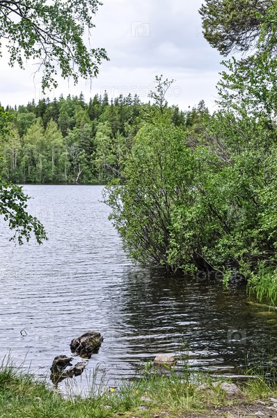 Летний лес. Озеро в лесу. Зеленые растения. Ели и лиственные деревья. Вода и деревья. Природа