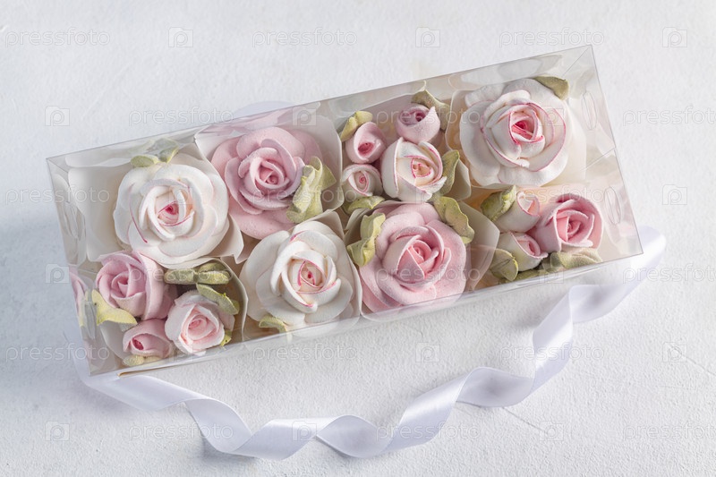 Зефирный букет цветов в коробке на светлом фоне