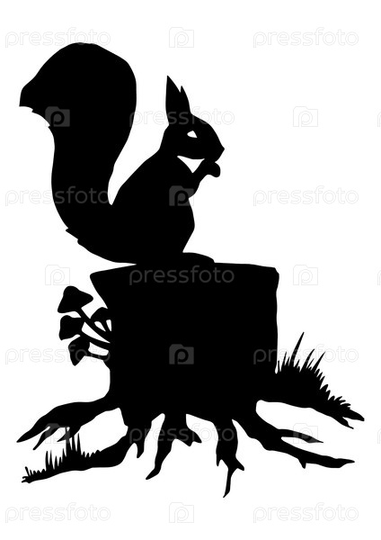 Фантастический векторный силуэт белки. Маленькая белка на дереве. Силуэт белки и грибы