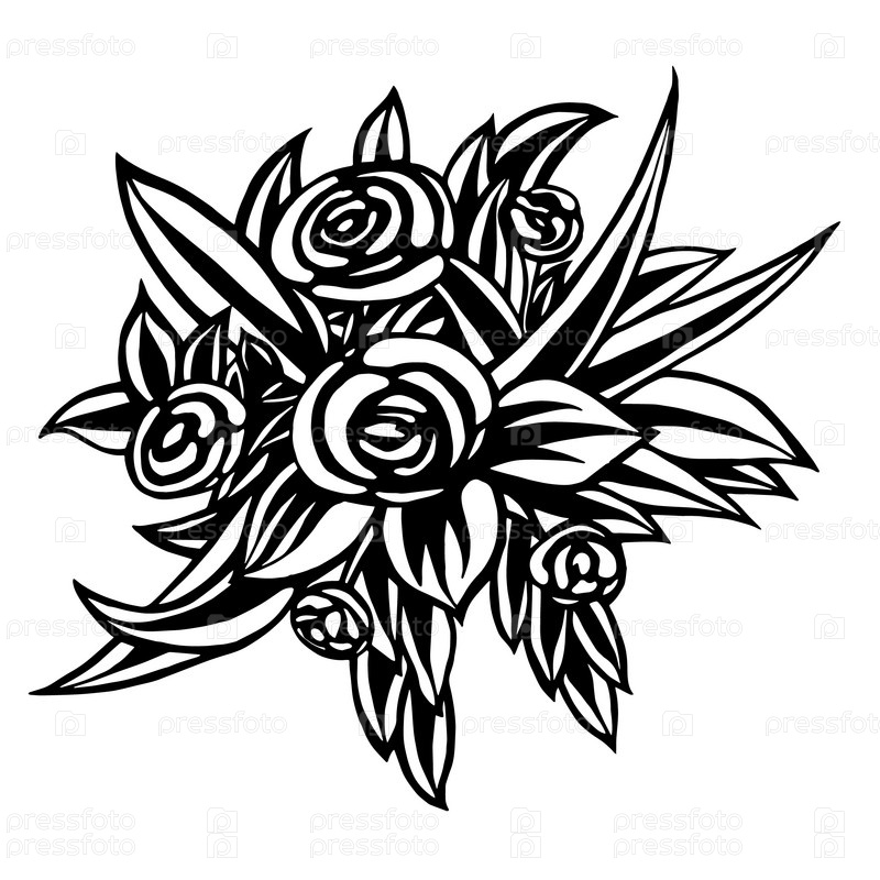 Фэнтезийный векторный силуэт цветов и листьев. Графика черными чернилами. Стилизованные розы и листья