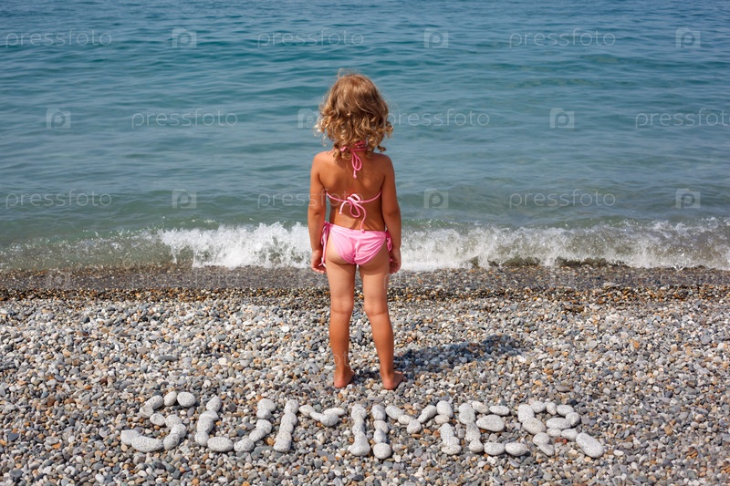 Маленькая девочка стоит на пляже рядом с водой