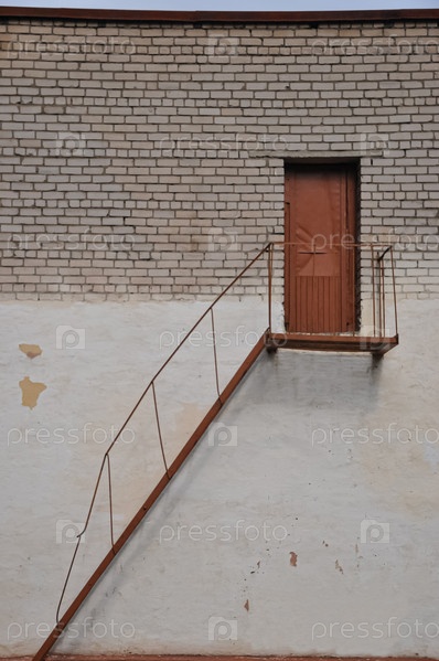 Кирпичная стена и дверь. Лестница к двери. Вход в здание. Пожарный выход. Аварийная дверь. Металлическая лестница. Эвакуационный выход. Ржавый металл. Старая стена. Стена здания