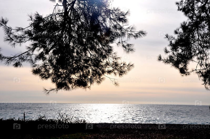 Закат в море. Берег моря. Силуэты деревьев на берегу. Силуэты ветвей у моря. Приморский. Закат солнца. Природа