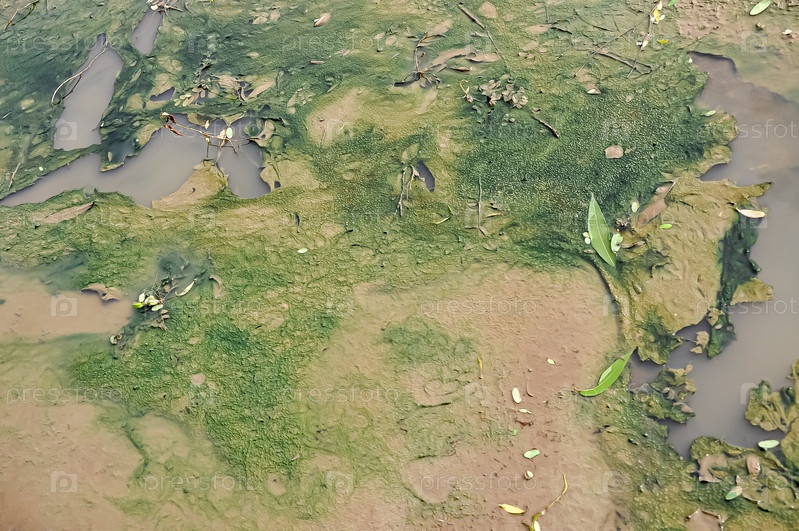 Цветение на пруду. Тина. Зеленые растения на воде