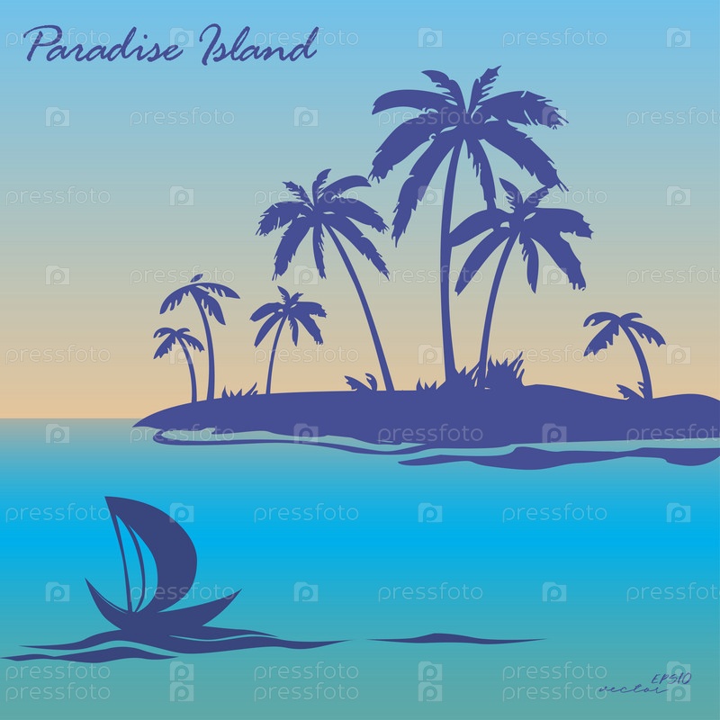 Райский остров с векторной иллюстрацией пальм. Векторная лодка и пальмы на градиентном фоне. Иллюстрация южных стран. Вектор экзотической природы. Вектор летних каникул. Праздничный отпуск
