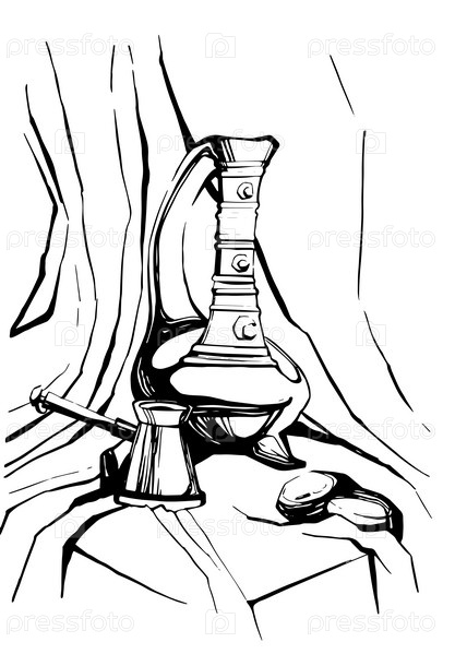 Фэнтезийный векторный натюрморт. Ахроматический натюрморт. Натюрморт с тканями и кувшином. Черно-белая графика. Чернила и краски для рисования. Кувшин и фрукты. Посуда в натюрморте