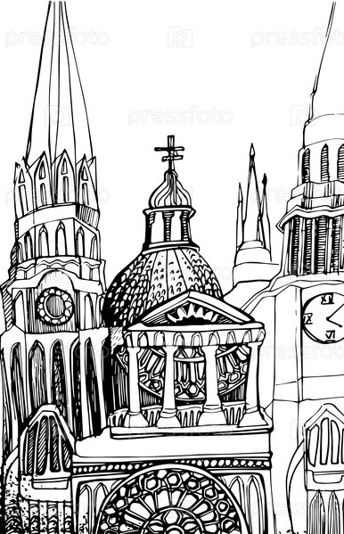 Фантастический векторный рисунок замка. Красивый замок тушью и пером. Эскиз здания. Фрагмент замка. Эскиз чернил. Графическая композиция. Готический замок