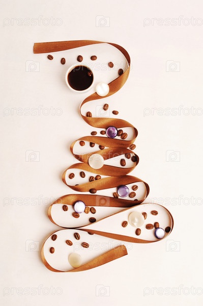 Елочка из атласной ленты, украшенная кофейными зернами и жемчужными шариками. Чашка черного кофе. Новый год