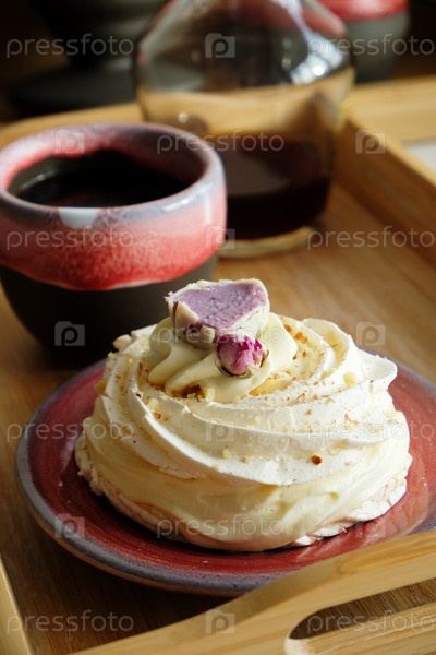 Десерт безе Павлова, украшенный цветком на фиолетово-красной дизайнерской керамической тарелке. чашка кофе