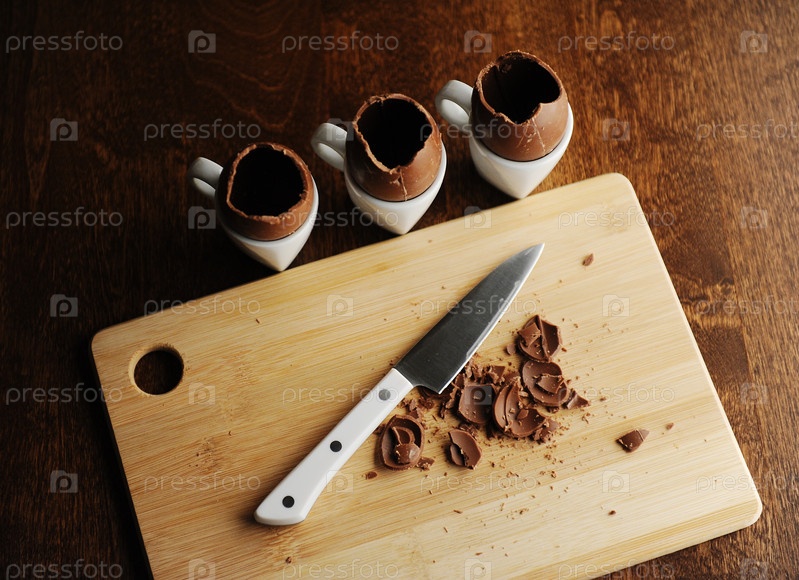 Пасхальный десерт, процесс приготовления. Шоколадные яйца вырезаны на деревянной доске. Вид сверху, нож. Темный фон