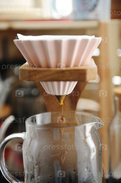 Заваривание кофе в розовой керамической капельнице оригами на деревянной подставке. Альтернативное ручное заваривание. Крупным планом